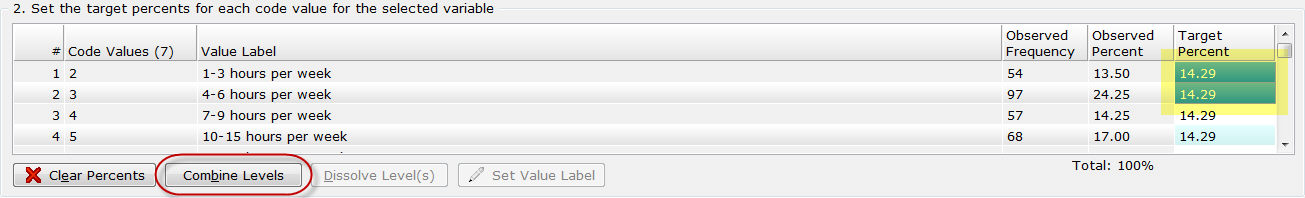 Use Clear Percents to initialize Target Percent to 0.00 for all code values of the selected variable.